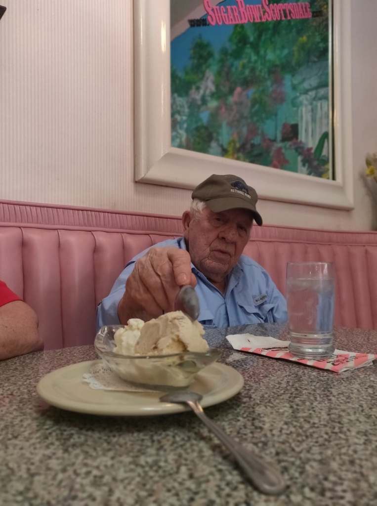 I’ve lived and worked in Telluride, worked on a Dude Ranch south of Yellowstone as the cook, outside Albuquerque in Mountainair at the Shafer Hotel, Hawaii, in Pahoa where the volcano was flowing again last year in a Castle, near Aspen, Ruidoso New Mexico, near Waco, TX, Pagosa Springs, and a few brief months in Fredricksburg, TX, Tucson, and north of Dallas. It was May of this year I brought Dad back here to Arizona, and we’ve settled into a routine that handles this stage of Moderate Severe Alzheimer’s with enrichment programs, good support groups, and nearby VA offices and services.