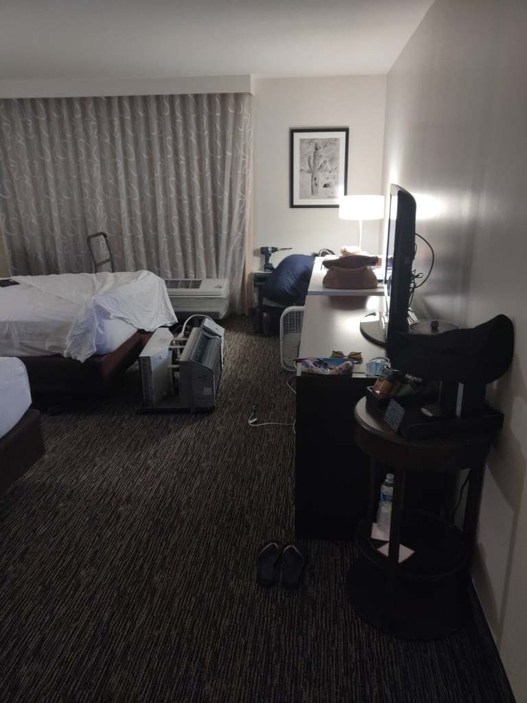Ok so, even in the time of Covid, we have to leave. It’s over 110 everywhere. I get two rooms at what should be a nice place in Scottsdale. The McCormick Scottsdale. They have a “staycation” offer on their website. Stay 24 hour period, check in flexible. I talk to the girl, tell her the need to leave, special needs elderly, adjoining rooms, yes, please, a Lake view. Seeing water after the year of locked in a desert home, sounds nice. Girl says 11 am, at least one room ready,